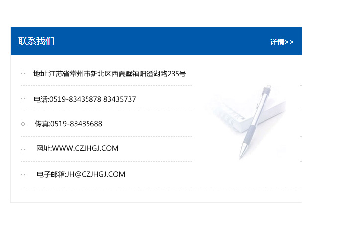 地址:常州市新北區(qū)友邦商務(wù)大廈1幢16、17層  電話:0519-85101652  傳真:0519-85112595  郵編:213022  網(wǎng)址:www.cz-jiayue_cn.shugeladi.com  郵箱:xiajifengaa@163.com